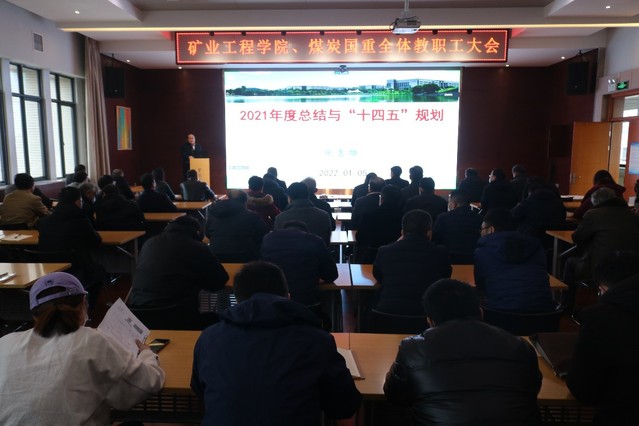 1月5日下午,学院、煤炭国重在学院楼学术报告厅A604、会议室A509(同步线上)召开了2021年度总结暨“十四五”规划解读会,全体教职工160余人参会。会上,张吉雄院长汇报了我院2021年度的工作总结,并解读了“十四五”规划;黄炳香主任汇报了煤炭国重2021年的各项工作和“十四五”规划情况。会议由学院党委书记陈新忠主持。