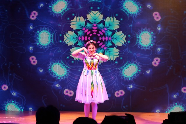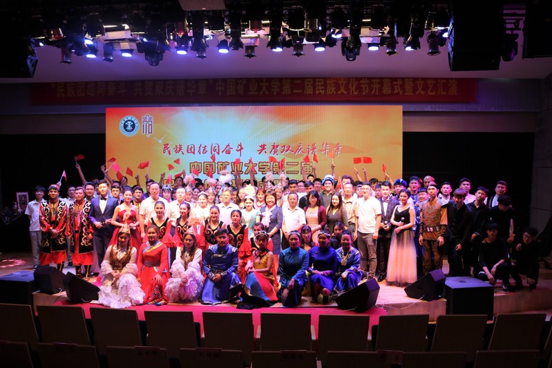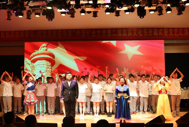 晚会现场,报告厅内师生欢聚一堂,共享民族文化盛宴。晚会由嘎玛次仁美朵等同学带来的《血汗泪》拉开帷幕,激情四射的舞蹈一下点燃了现场的气氛。阿丽耶同学的独舞《恋》展现了民族舞蹈的柔美;塞米、热普凯提的吉他弹唱《一见钟情》、阿升的《你的爱情》、白松的《忘不了》、陈跃鹤、胡笳音的《我爱你塞北的雪》以不同的音乐形式将民汉文化、传统与现代文化结合并表现的淋漓尽致;萨日娜等的舞蹈《查干木仁》、阿迪莱等的《刀郎舞》、加依娜尔等的《哈山的婚礼》,以舞蹈彰显民俗精髓,使人身临其境,独具韵味;由启明艺术团、祖丽阿娅提等表演的情景剧《盛开在矿大的民族花》,让在场师生们感受到民族间和谐融洽、友好团结的氛围,深刻诠释了学生成长成才的心路历程,具有很强的激励意义;由精武舞狮团带来的《舞狮双庆》、努尔艾力等带来的走秀《步履生花》更是为晚会增添了几分绚丽色彩,将现场气氛推到了高潮;晚会在闹娜、孙靖等师生合唱的《国家》中落下了帷幕,悠扬激昂的歌声传递着莘莘学子浓浓的爱国豪情。