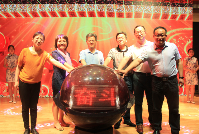 校党委副书记蔡世华和相关部门负责人上台共同开启民族文化节开幕启动水晶球,“民族团结同奋斗、共贺双庆谱华章”污污漫画