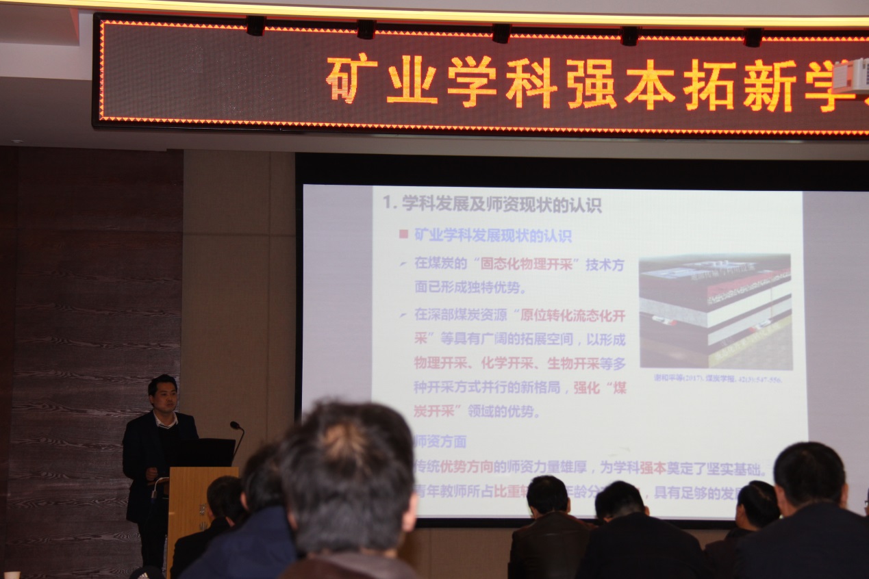 下午第一阶段会议有5位教师汇报。曹安业教授在强本基础上,提出拟在海底强流态状态下或太空微重力状态下采矿岩层破断的地球物理监测方法方面开展探索的设想;李小林副教授介绍了工业工程学科的概念、学科层次、相关学校以及学科现状,提出了融入采矿,开展矿业资源生产管理系统优化、矿业大数据分析与挖掘、基于虚拟仿真的矿山智能化开采系统建设等新方向研究的设想;王方田副教授以海域天然气水合物开采方法与灾害防控为题介绍了个人在拓新方面取得的初步成果,并就下一步研究重点和目标进行了展望;张源副教授对一流学科建设方向进行了分类,提出了主攻目标,建议以研究所形式组建团队,介绍了地热开发的拓新内容与目标;周楠副教授提出了对地下城市工程新工科专业建设方面的疑问,提出了矿井隔热充填材料研发与矿井降温的拓新方向。