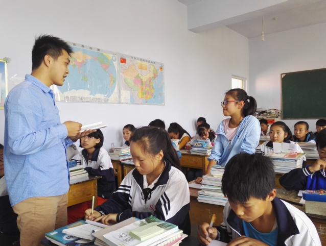 石家田九年制学校坐落在距离县城30公里处的大山深处,是矿大支教团服务地中教学资源最贫乏的一所学校,全校加上支教团只有33名老师,小学甚至要一个老师负责一个年级的所有课程,他在石家田九年制学校负责两个班级的政治、一个班级的数学、还有六个年级的微机,并且暂代过一个月的初二班主任,每周的课时最多达到23课时,苦累交加,但是孩子们那一双双渴求知识的眼睛一直是他始终保持饱满工作热情的不竭动力,起早陪学生晨读,贪黑为学生补课,一天到晚都在不知疲倦地疯狂工作。然而最令他头疼的是,学生基础十分薄弱,家长很多时候都在忙农活,学生在假期中还要帮助家里干活,学生的学习水平参差不齐。面对这样的情况,他认真思考,与每一名同学促膝交谈,尤其是留守儿童,成为学生的好朋友,走进学生的内心深处,周末到附近村庄的每一个学生家访,充分了解学生的学习生活情况,努力做到因材施教。他曾代表石家田九年制学校参加灵丘县赛课活动并获得优秀奖,几次考试的成绩均分和优生率均达到学校历史新高,获得了校长和老师们的一致好评。