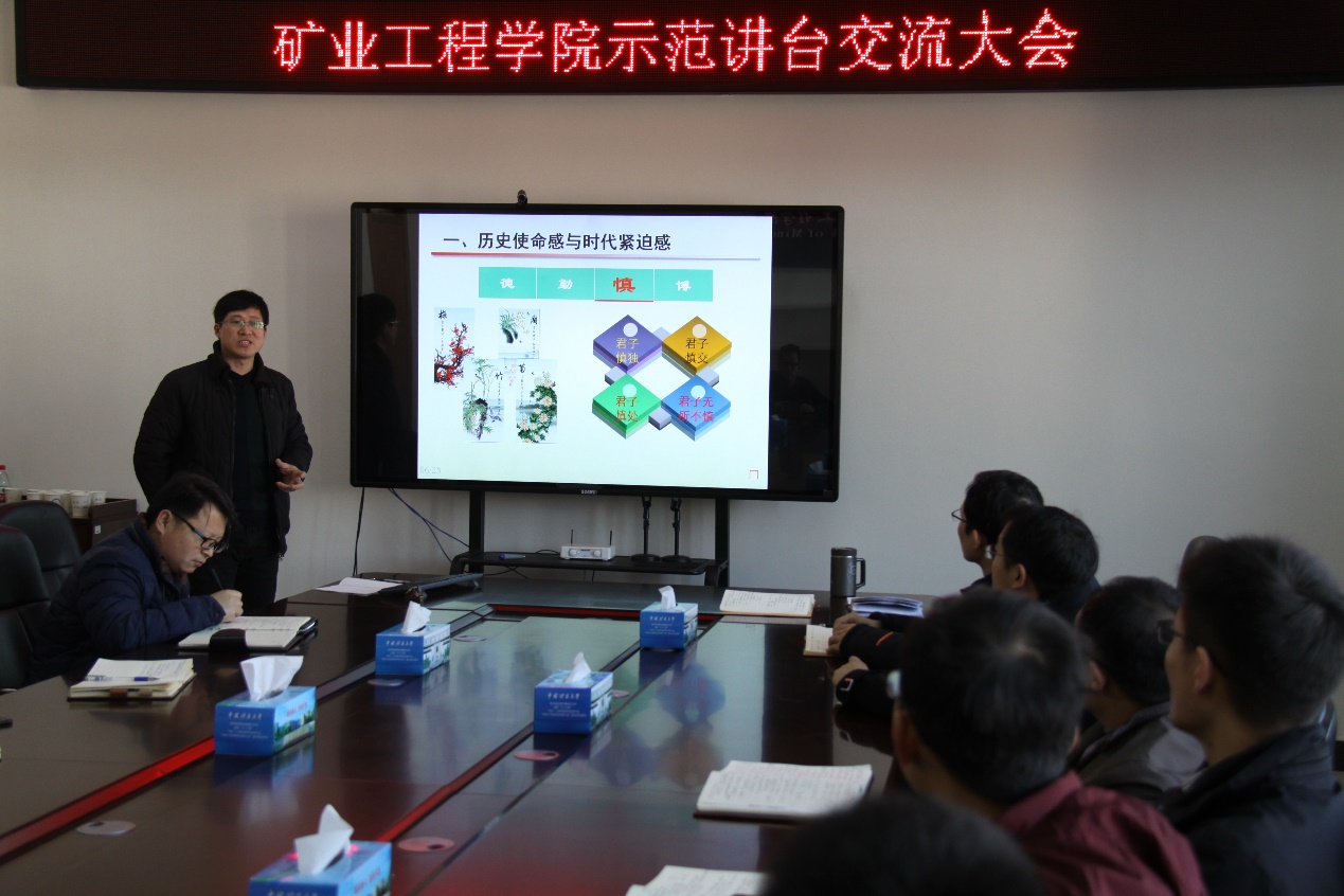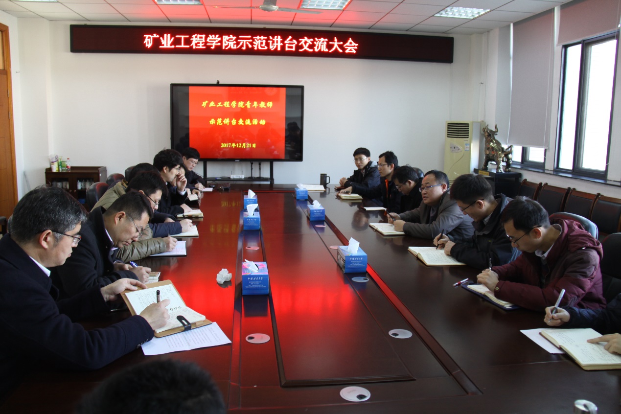 12月21日上午9:00,矿业学院工会按照学院提高教学质量的工作部署,在A509召开青年教师示范讲台交流会。矿业学院党委书记陈新忠、工会主席马文顶、特邀主讲教师郑西贵教授、新入职教师及采矿系青年教师共20余人参加了此次交流会,校、院青工委员王旭锋教授主持会议。
