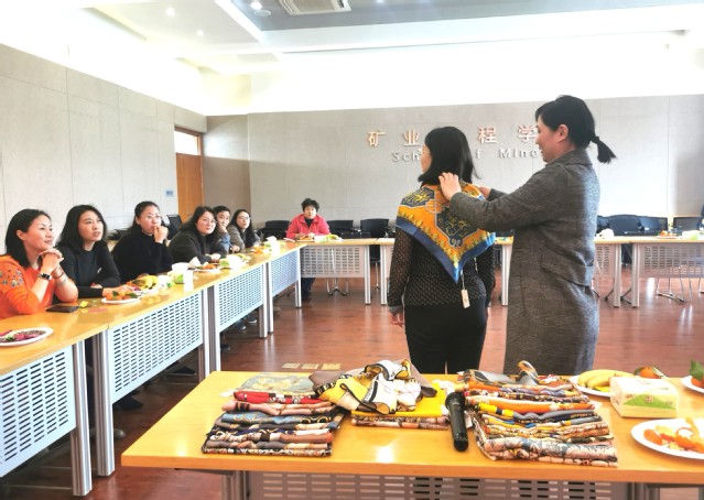 活动现场,来自徐州市金鹰店丝巾专业搭配老师为大家讲解了丝巾的搭配技巧,并详细演示了丝巾的多种系法和搭配技巧。随后,热情高涨的女教工们在专业老师的指导下,现场进行了丝巾系法与服饰搭配展示。