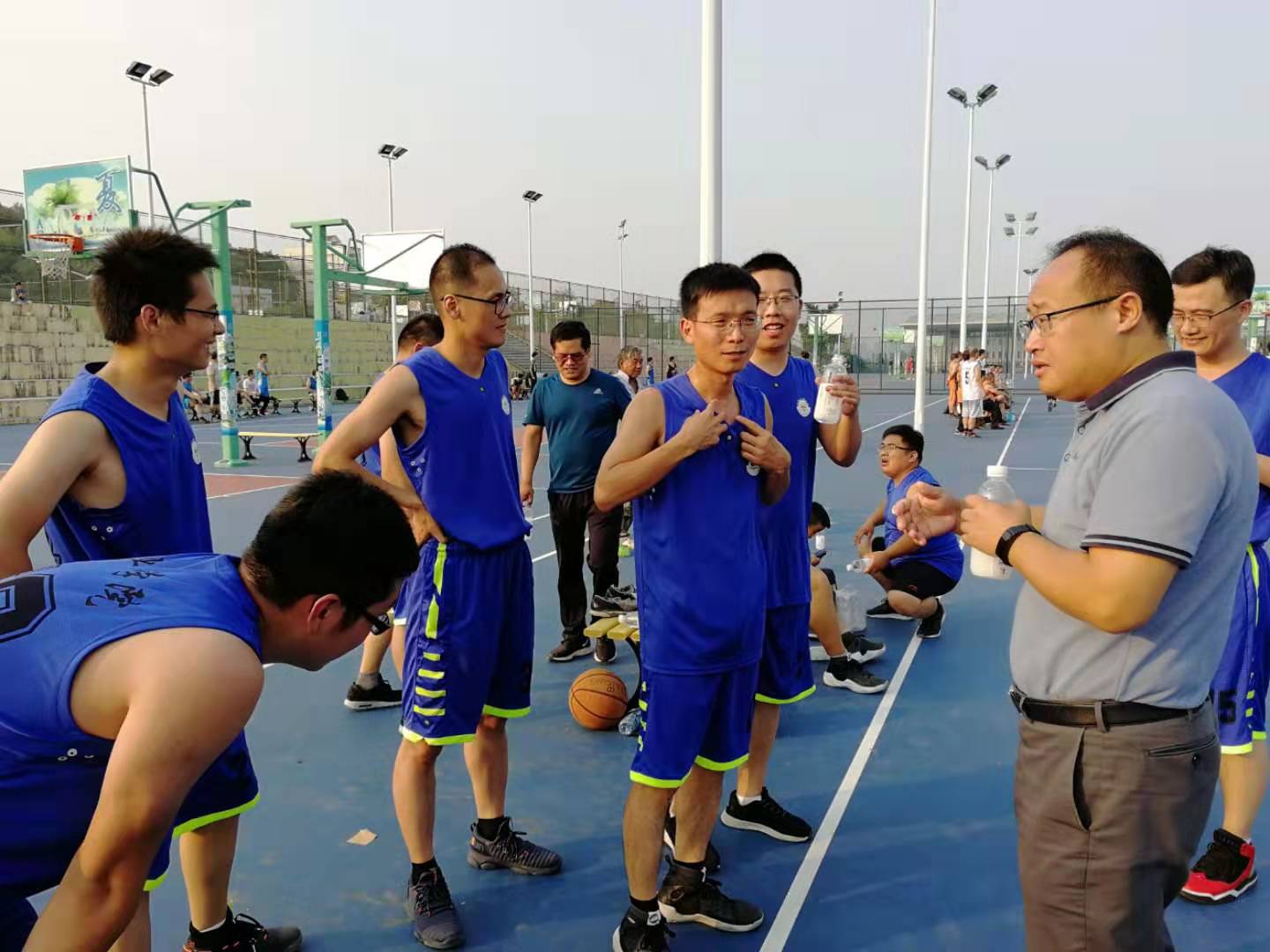 赛场边,学院党委书记陈新忠老师身兼多个角色,既是教练,又是服务人员,还是拉拉队队长。暂停时段及时布置战术,规划场上人员任务分工,比赛中又是带头呐喊助威,得分了鼓掌激励队员,失误了安慰队员赶紧回防,僵持了指挥队员更换战术。在大家的共同努力下,矿业学院篮球队连战告捷。