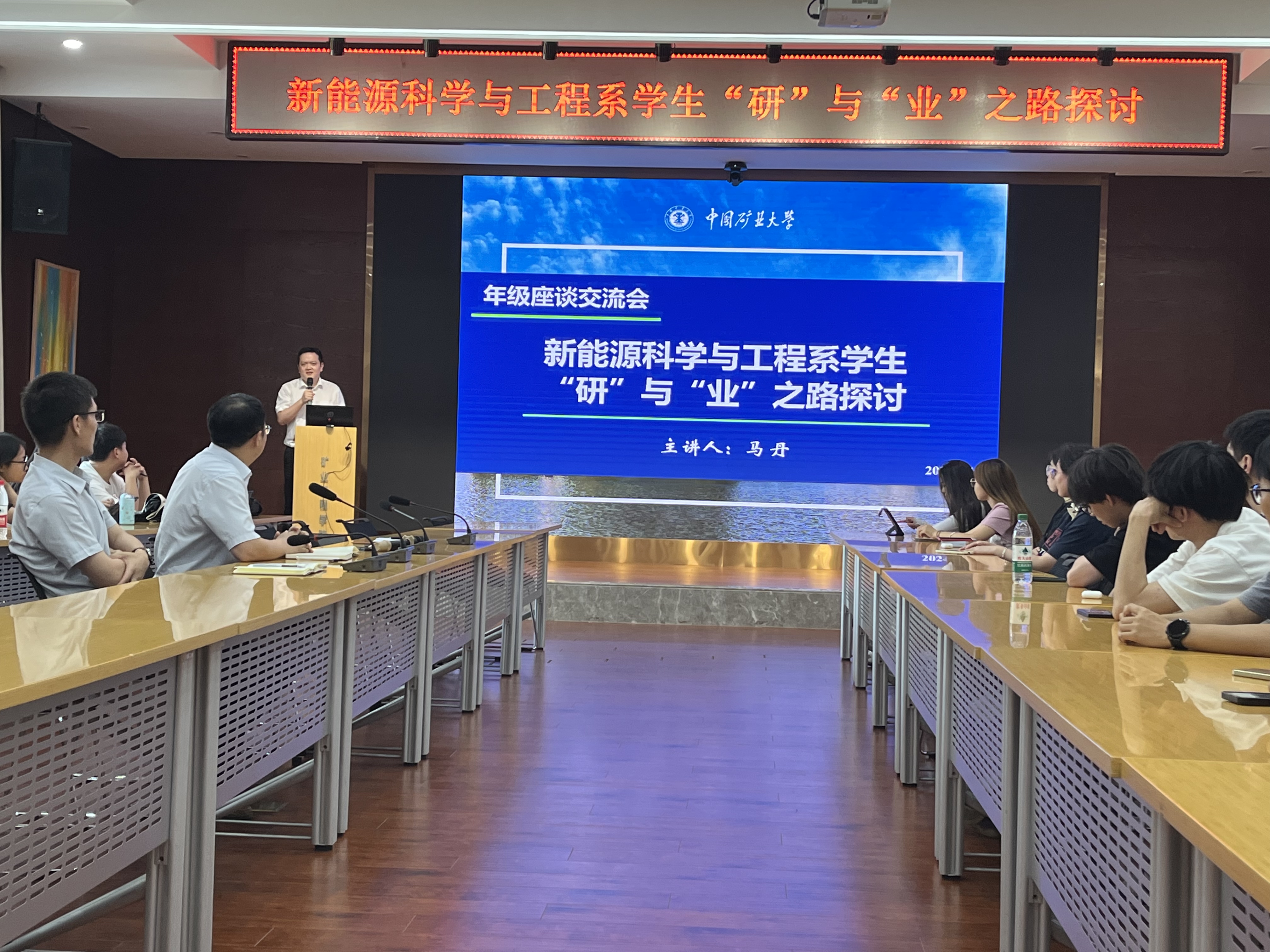A604召开“研”与“业”之路探讨及2024年暑期实习实践布置会。新能源科学与工程系主任马丹,系副主任严红、张源,赵立明老师,2021级和2022级新能源科学与工程专业全体本科生参加会议。