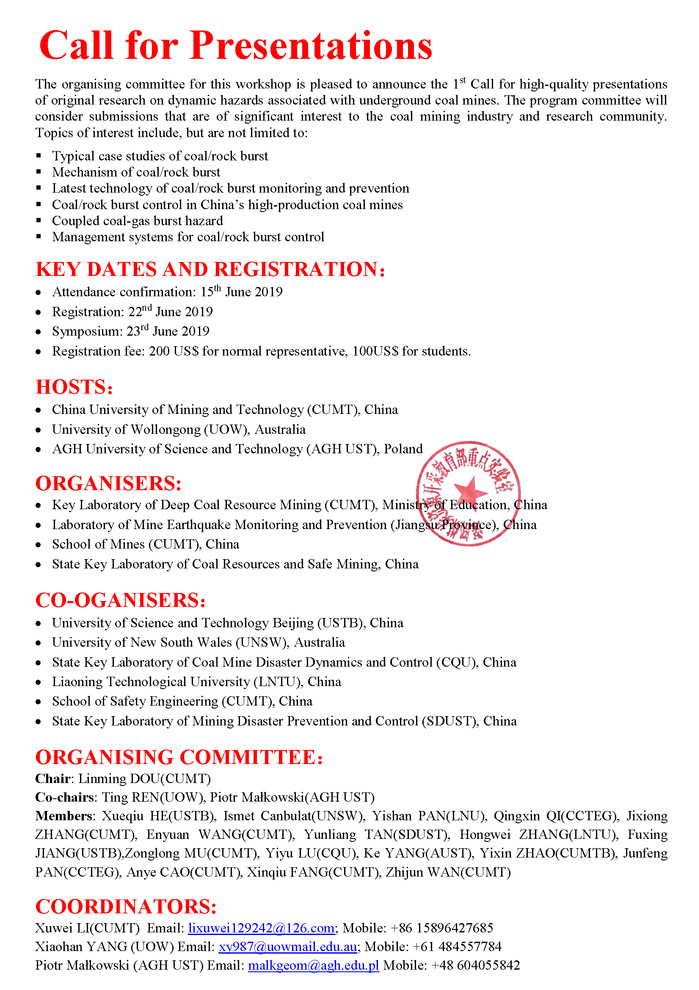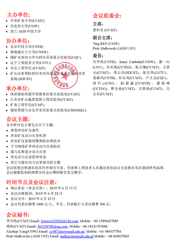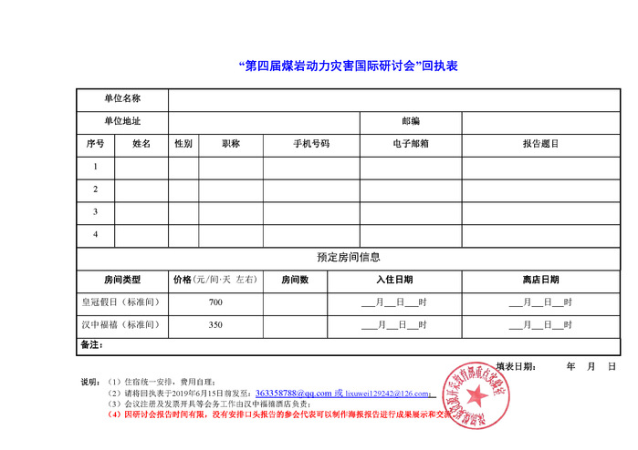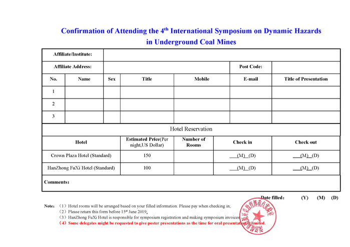 通知公告 污污漫画 - 通知公告 - 正文 第四届煤岩动力灾害国际研讨会(第三轮) 作者:董成亮浏览:时间:2019-06-19 回执表.docx回执表.docxConfirmation.docx 新闻来源:污污漫画 摄影: 责任编辑: 审核: