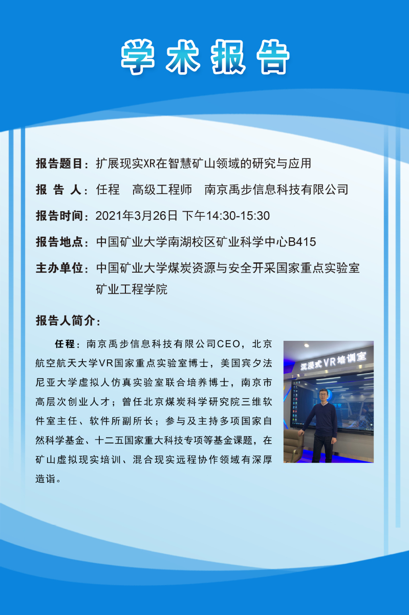 学术会议 污污漫画 - 学科动态 - 学术会议 - 正文 学科报告:扩展现实XR在智慧矿山领域的研究与应用 作者:董成亮浏览:时间:2021-03-25 新闻来源:煤炭资源与安全开采国家重点实验室 摄影: 责任编辑: 审核: